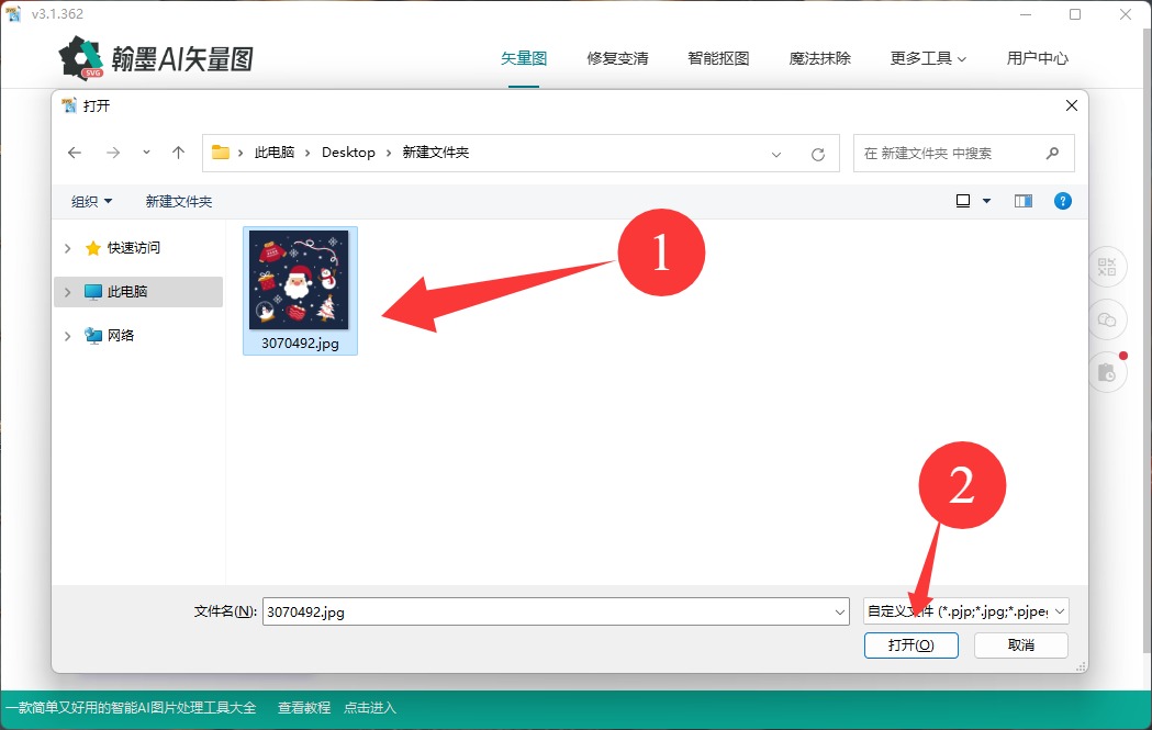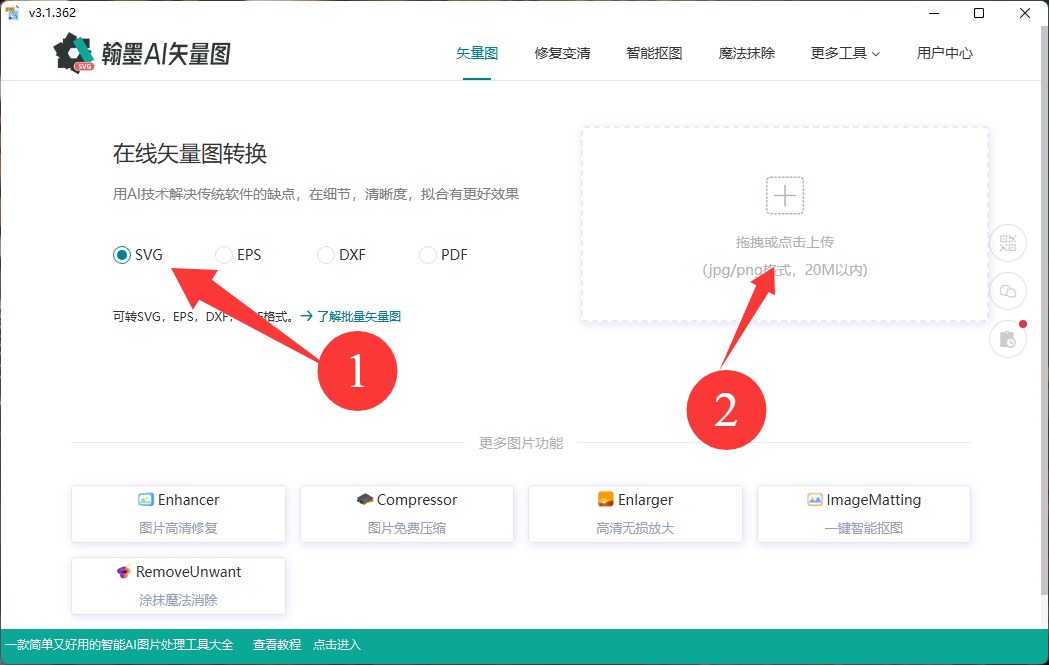 打開翰墨AI矢量圖轉換器軟件,先確定一下我們需要轉換的矢量圖格式,這里我們按照默認的svg格式演示。然后點擊打開本地文件夾上傳素材圖片;