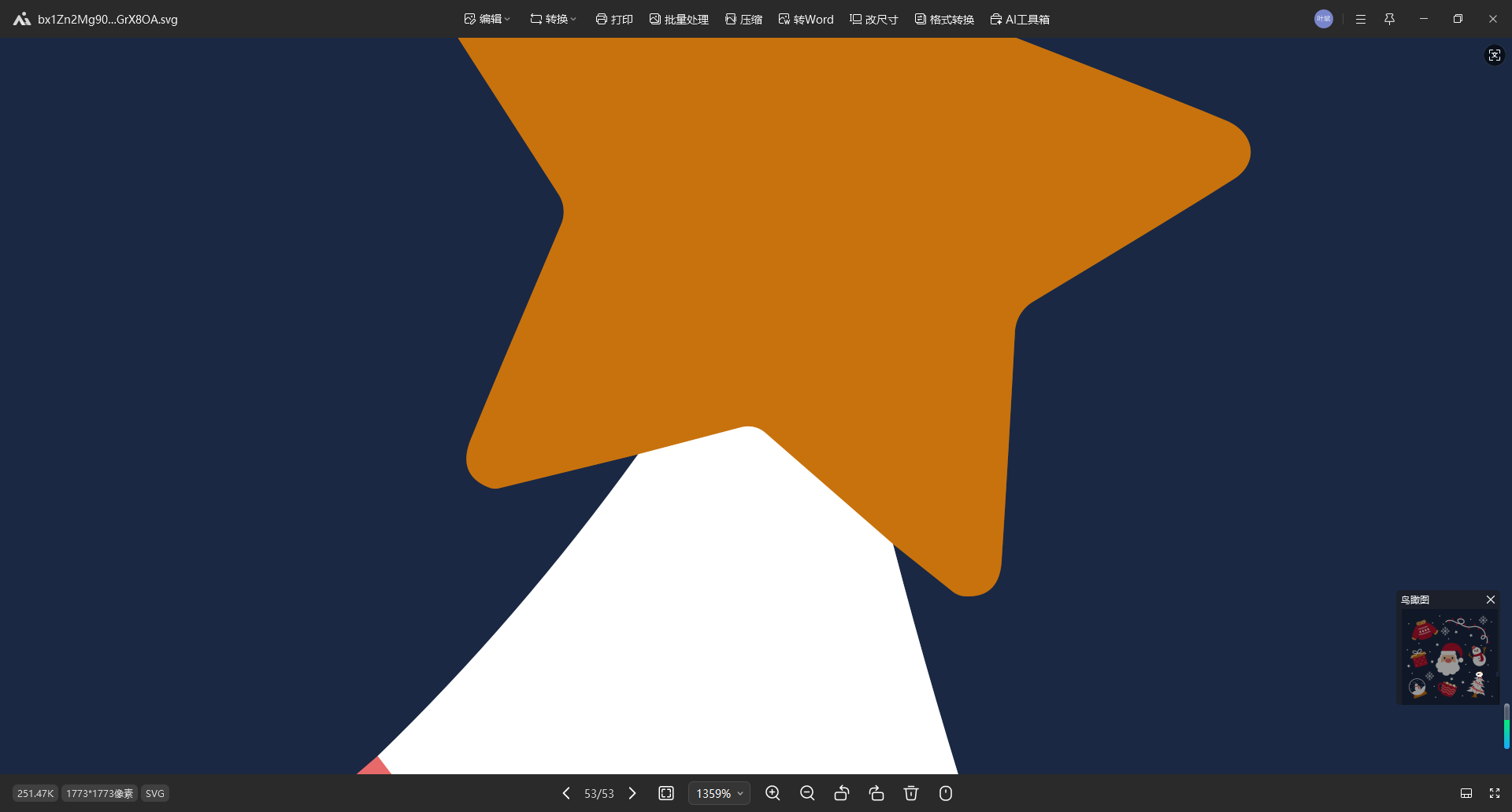 將下載的SVG矢量圖文件使用打開查看,放大到原圖素材中小樹頂端可以看到上面的小星星的邊沿都是非常清晰細膩沒有任何鋸齒感,而且整個圖的顏色都是非常飽滿不失真,效果是非常值得稱贊的。