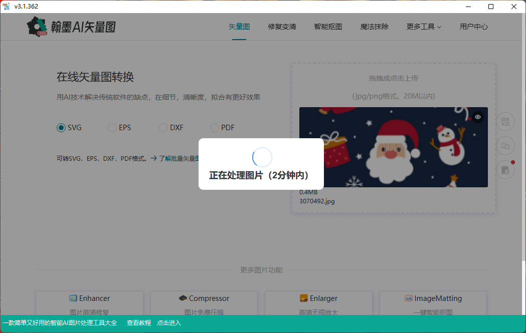接下來翰墨AI矢量圖轉換器將自動完成識別以及轉換工作,我們只需要等它完成即可。過程中請勿關閉軟件或者刷新網頁版,轉換的時間長短是根據圖片素材的文件大小以及構圖的復雜程度甚至是用戶端網絡快慢有關。